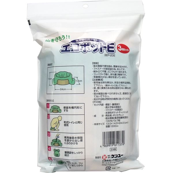 【使用方法】(1)便器を楕円形にする(2)和式トイレと同じ使用(3)使用後吸水樹脂を袋から出し便にふりかける(4)畜便袋をしっかり結ぶ(5)便袋に入れ、ファスナーをしっかり閉じる【セット詳細】便器・・・1蓄便袋・・・3高分子吸水樹脂・・・3ファスナー付便袋・・・3水溶性ポケットティッシュ・・・3【携帯登山用トイレ エコポットE 大便用の原材料】再生紙、ポリエチレン、吸水樹脂(食添殺菌剤混合)、100%パルプ紙【規格概要】本体サイズ・・・13.0*14.0*24.0cm容量・・・1000cc【注意事項】・使用後は持ち帰るか、所定の場所まで移動して下さい。