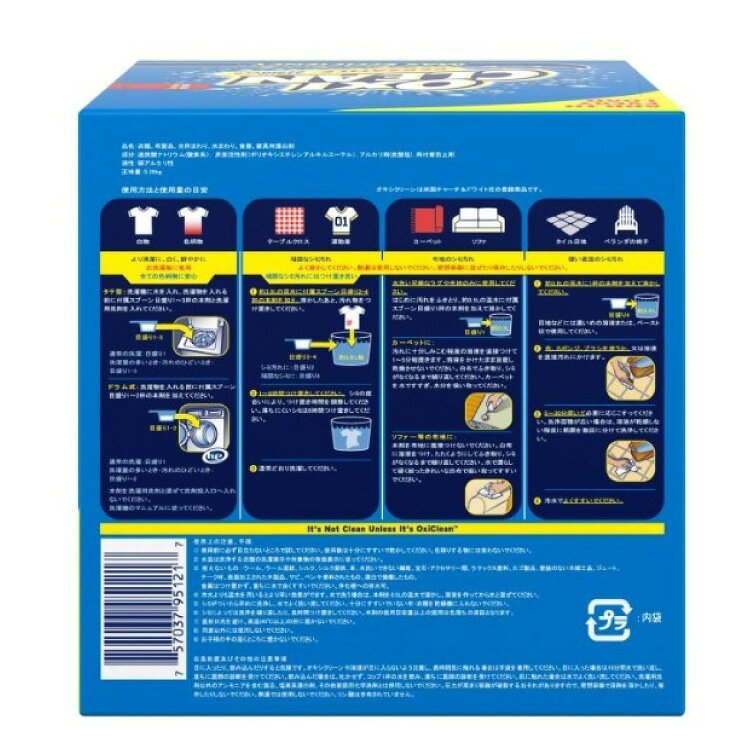 【商品名】 オキシクリーン 【内容量】 5.26kg 【原産国】 アメリカ 【全成分】 過炭酸ナトリウム(酸素系)、界面活性剤(ポリオキシエチレンアルキルエーテル)、アルカリ剤(炭酸塩)、再付着防止剤 【ご使用方法】 約3.8Lの温水に付属スプーン目盛り2〜4杯のオキシクリーンを完全に溶かします。
