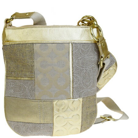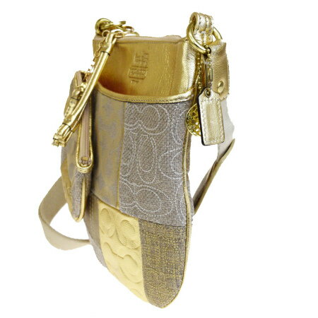 【中古】 美品 コーチ COACH シグネチャー オプアート 斜め掛け ショルダーバッグ ポシェット ゴールド キャンバス レザー 42683 07HD201